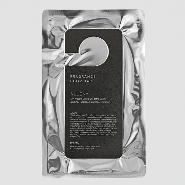 room tagALLEN* room tag Top: Freesia, Cassis Middle: Lily, Lily of the Valley, Jasmine, Tuberose Last: Heliotrope, Carnation A thick room tag saturated with original retaW scent to colour your interior spaces with fragrance. room tagALLEN* ALLEN* family An invigorating, floral lily fragrance with a sour twist. fabric sprayALLEN* ¥3,380 add to cart fabric conditionerALLEN* ¥3,380 add to cart candleALLEN* ¥9,100 add to cart candleALLEN* ¥9,750 add to cart candleALLEN* ¥9,100 add to cart room sprayALLEN* ¥5,980 add to cart desktop 25mlALLEN* ¥4,550 add to cart standard 300mlALLEN* ¥14,300 add to cart car tagALLEN* ¥2,080 add to cart Hoodie ALLEN* / WHITE ¥14,300 add to cart room tag collection room tagNATURAL MYSTIC* ¥2,600 add to cart room tagEVELYN* ¥2,600 add to cart room tagLOEB* ¥2,600 add to cart